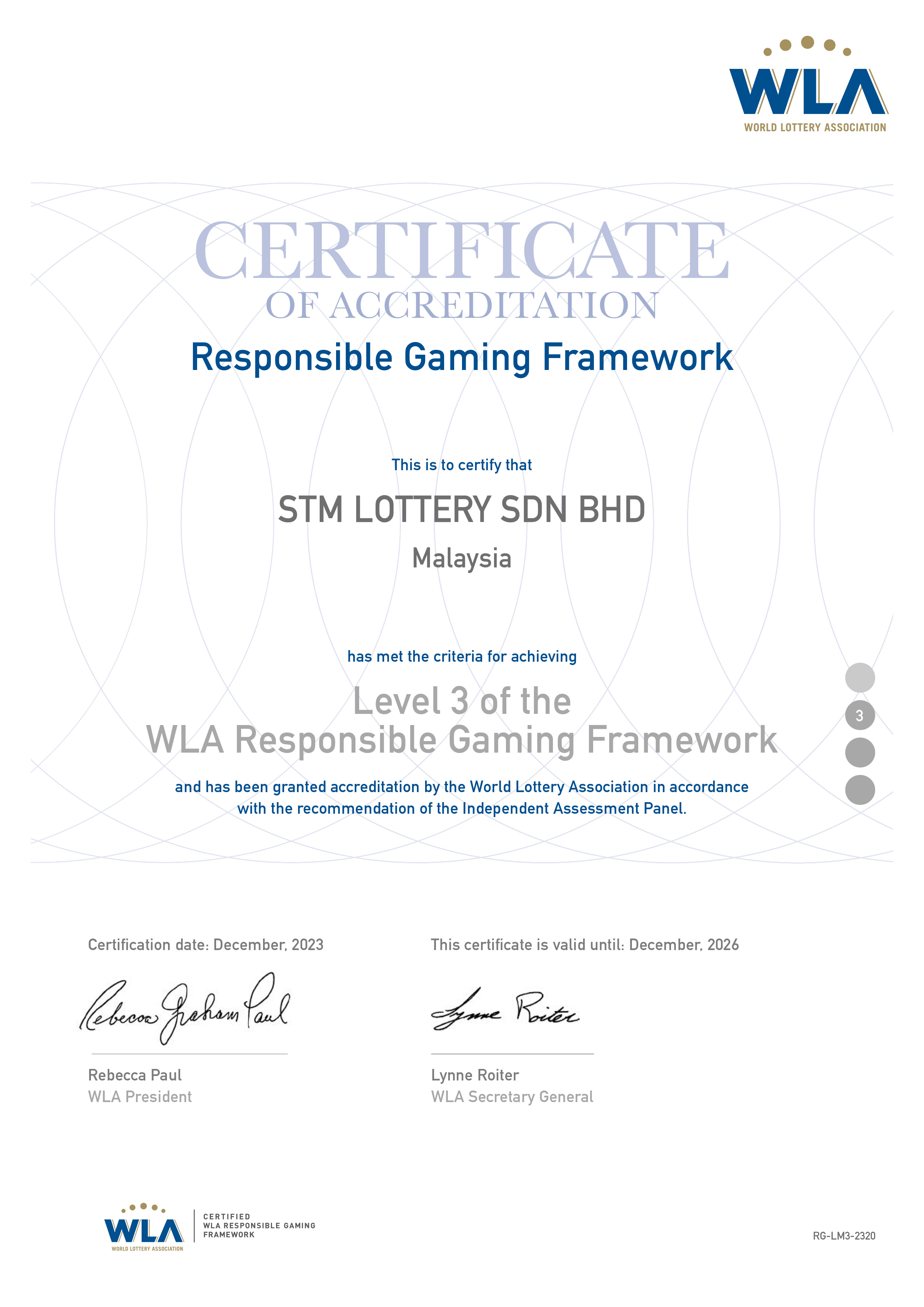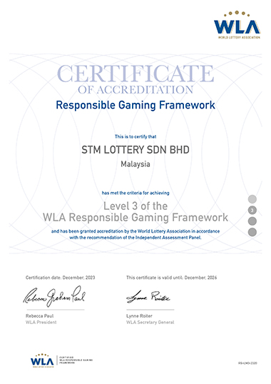 Sports Toto has been accorded the Certificate of Accreditation in Level 3 of the WLA Responsible Gaming Framework after having secured its Level 2 previously. The acknowledgement underscores STM Lottery's unwavering commitment to promoting RG practices and ensuring the highest standards of player protection. The WLA RG Framework is a comprehensive set of guidelines designed to assess and enhance the RG initiatives of lottery organisations worldwide. The WLA is a global association of state lottery and gaming organisations representing more than 150 lotteries, from more than 80 countries. WLA aims to be a global authority on the lottery business, to uphold the highest ethical principles and support its members to achieve their visions.