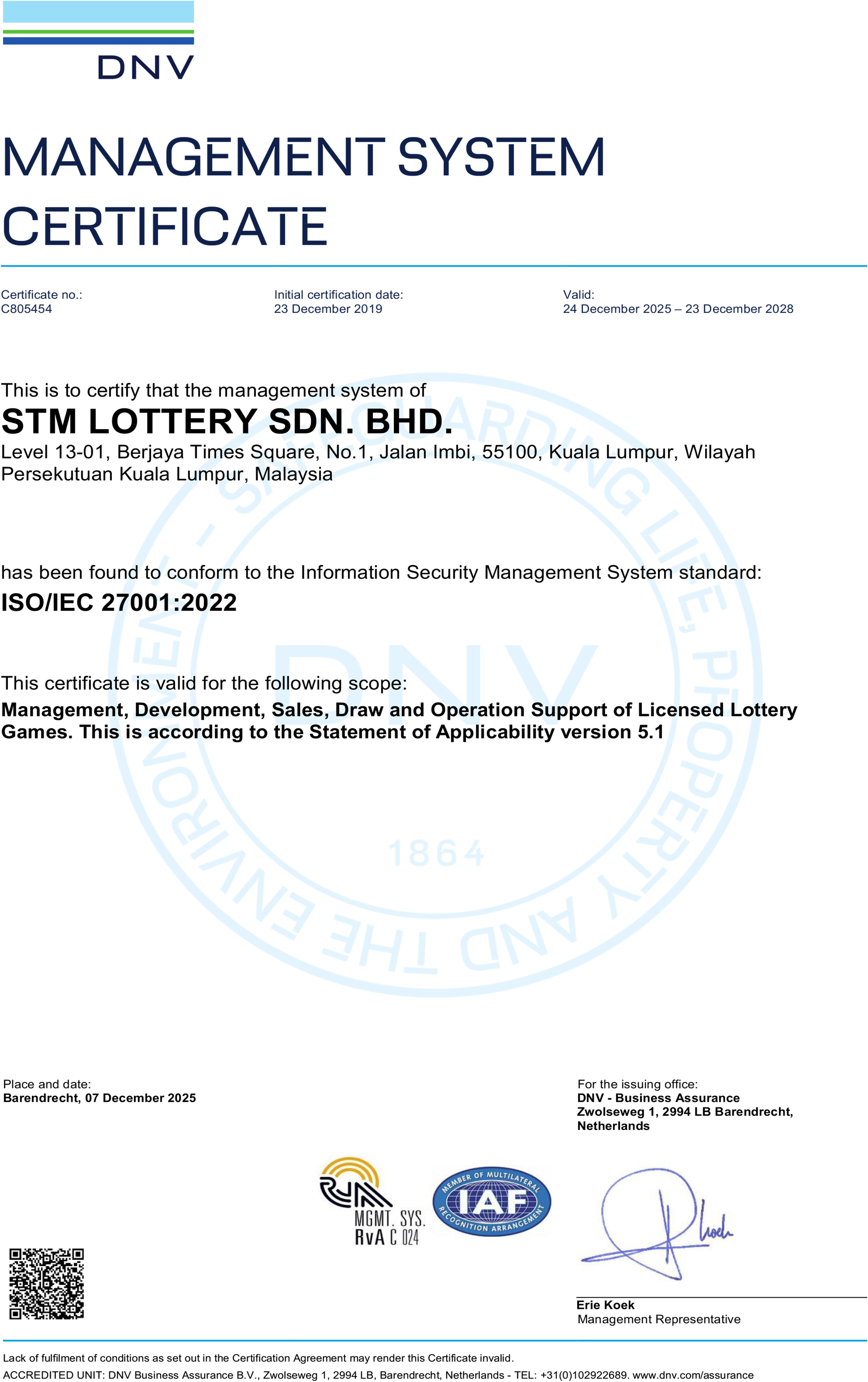 With this accreditation, Sports Toto Malaysia has met the stringent requirements of ISO/IEC 27001:2022 for establishing, implementing, maintaining and continually improving its Information Security Management System (ISMS), together with additional security requirements set forth by the WLA, including lottery specific security and integrity controls.