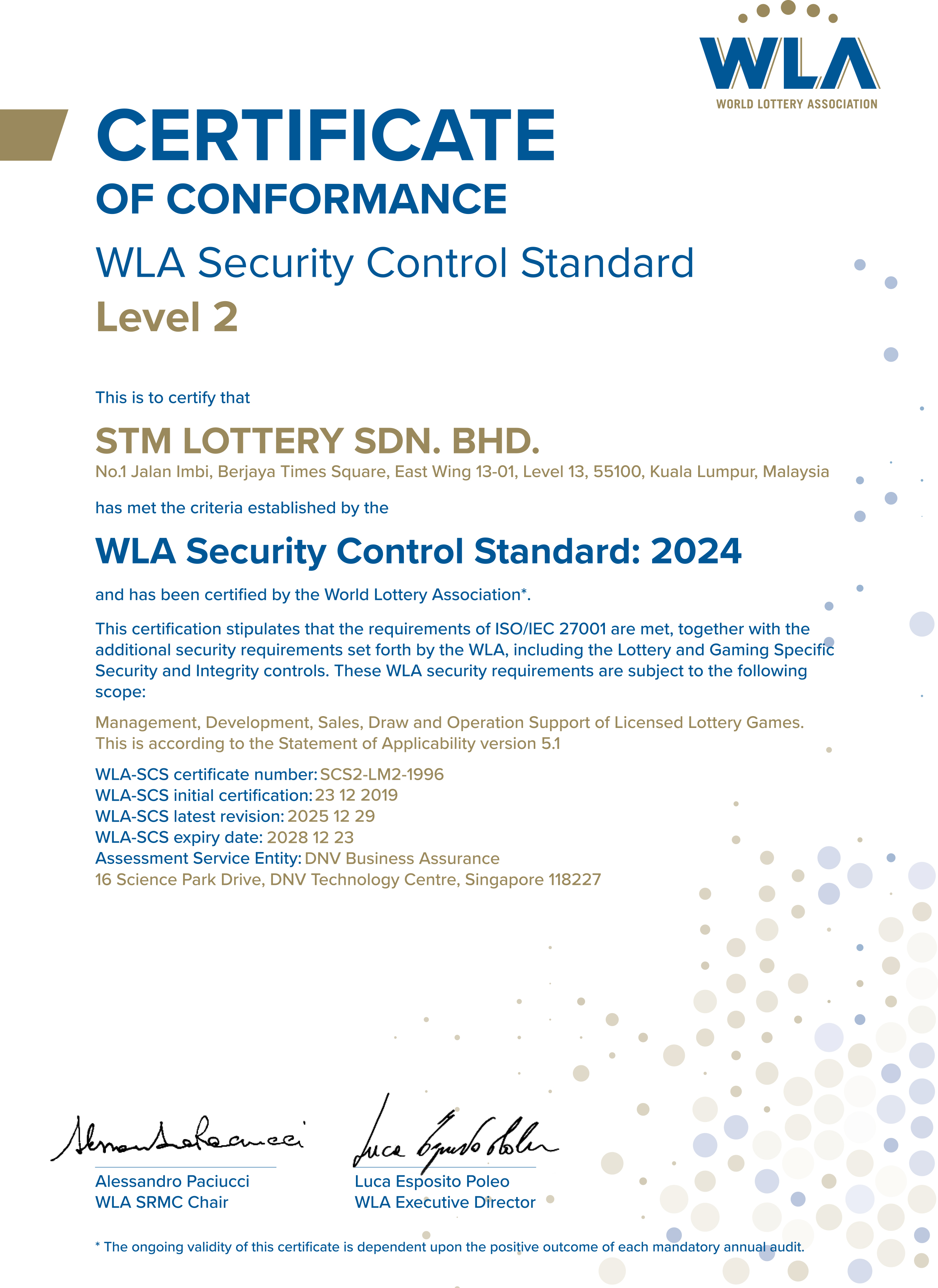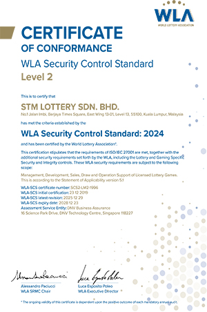 STM Lottery Sdn Bhd has attained the World Lottery Association Security Control Standard:2024 (WLA-SCS:2024) certification.